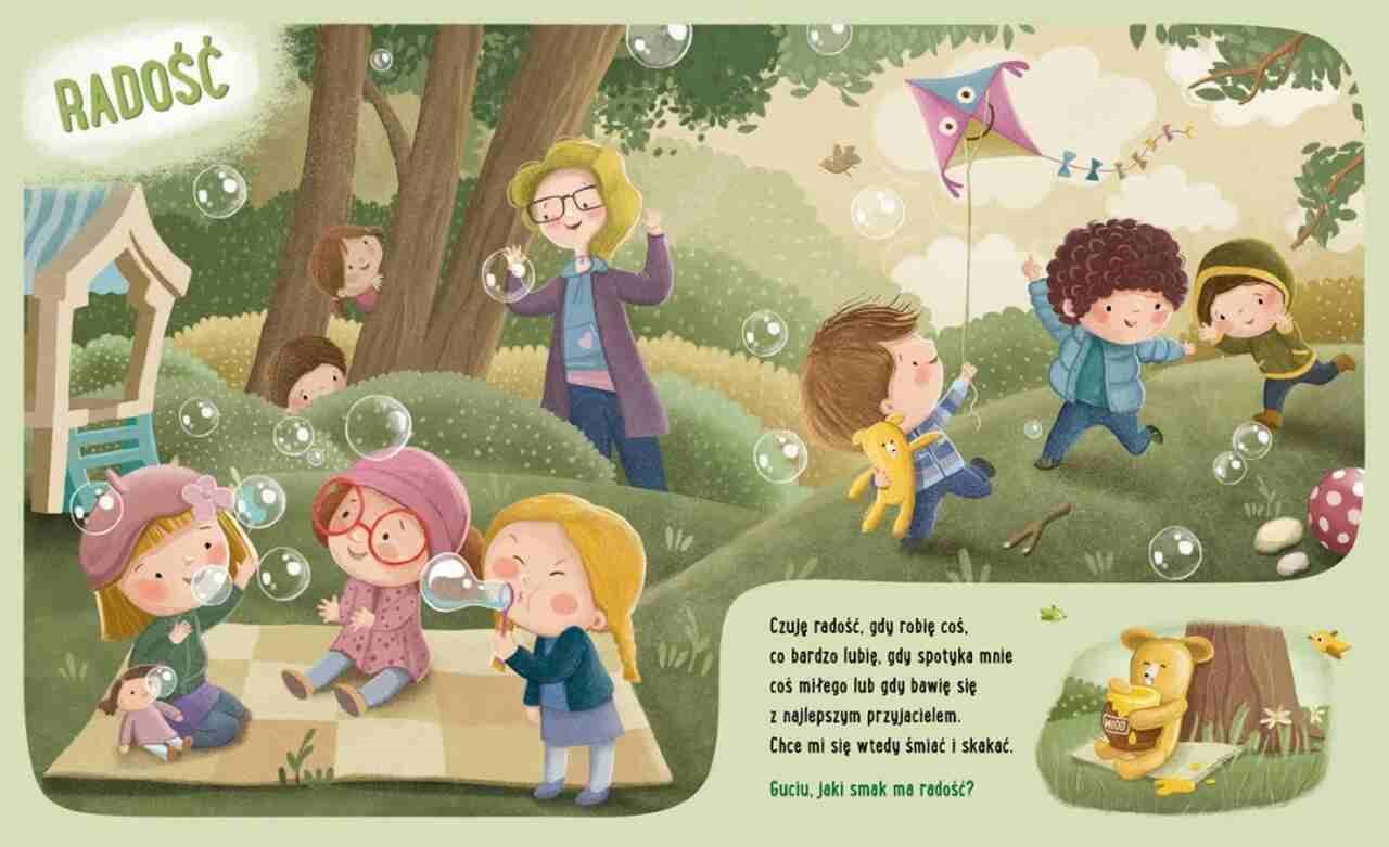 Nieodłącznym towarzyszem Felusia jest miś Gucio, który pomaga zrozumieć to, co trudne do nazwania. Tłumaczy emocje poprzez zmysły i skojarzenia - radość może smakować słodko, spokój przypominać delikatną muzykę, a tęsknota kojarzyć się z deszczowym dniem. Takie obrazowe porównania wspierają rozwój inteligencji emocjonalnej dziecka i zachęcają do rozmowy z rodzicami lub opiekunami.