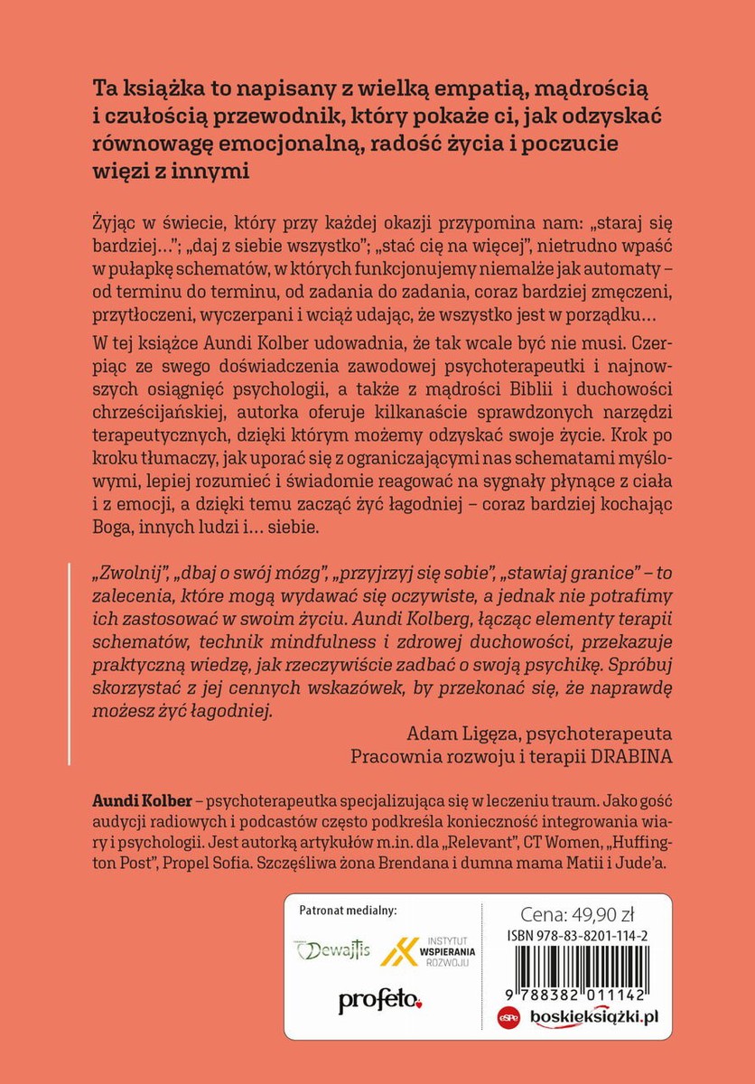 W tej książce Aundi Kolber udowadnia, że tak wcale być nie musi. Czerpiąc ze swego doświadczenia zawodowej psychoterapeutki i najnowszych osiągnięć psychologii, a także z mądrości Biblii i duchowości chrześcijańskiej, autorka oferuje kilkanaście sprawdzonych narzędzi terapeutycznych, dzięki którym możemy odzyskać swoje życie. Krok po kroku tłumaczy, jak uporać się z ograniczającymi nas schematami myślowymi, lepiej rozumieć i świadomie reagować na sygnały płynące z ciała i z emocji, a dzięki temu zacząć żyć łagodniej – coraz bardziej kochając Boga, innych ludzi i… siebie.