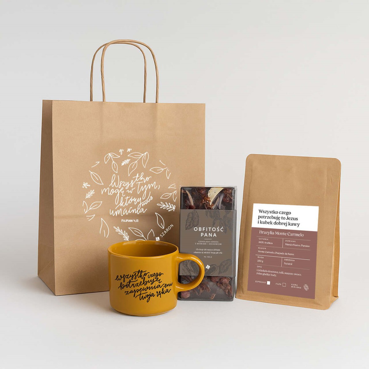 Wyjątkowy zestaw prezentowy dla miłośników kawy i dobrych słów - idealny na każdą okazję! W eleganckiej papierowej torbie znajdziesz kubek z inspirującym cytatem biblijnym, aromatyczną kawę Brazylia Monte Carmelo oraz czekoladę „Obfitość Pana” z chrześcijańskiego wydawnictwa Szaron.