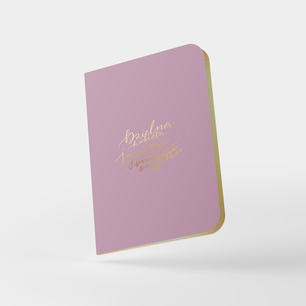 - różowa okładka z ekoskóry ze złoconym tłoczeniem