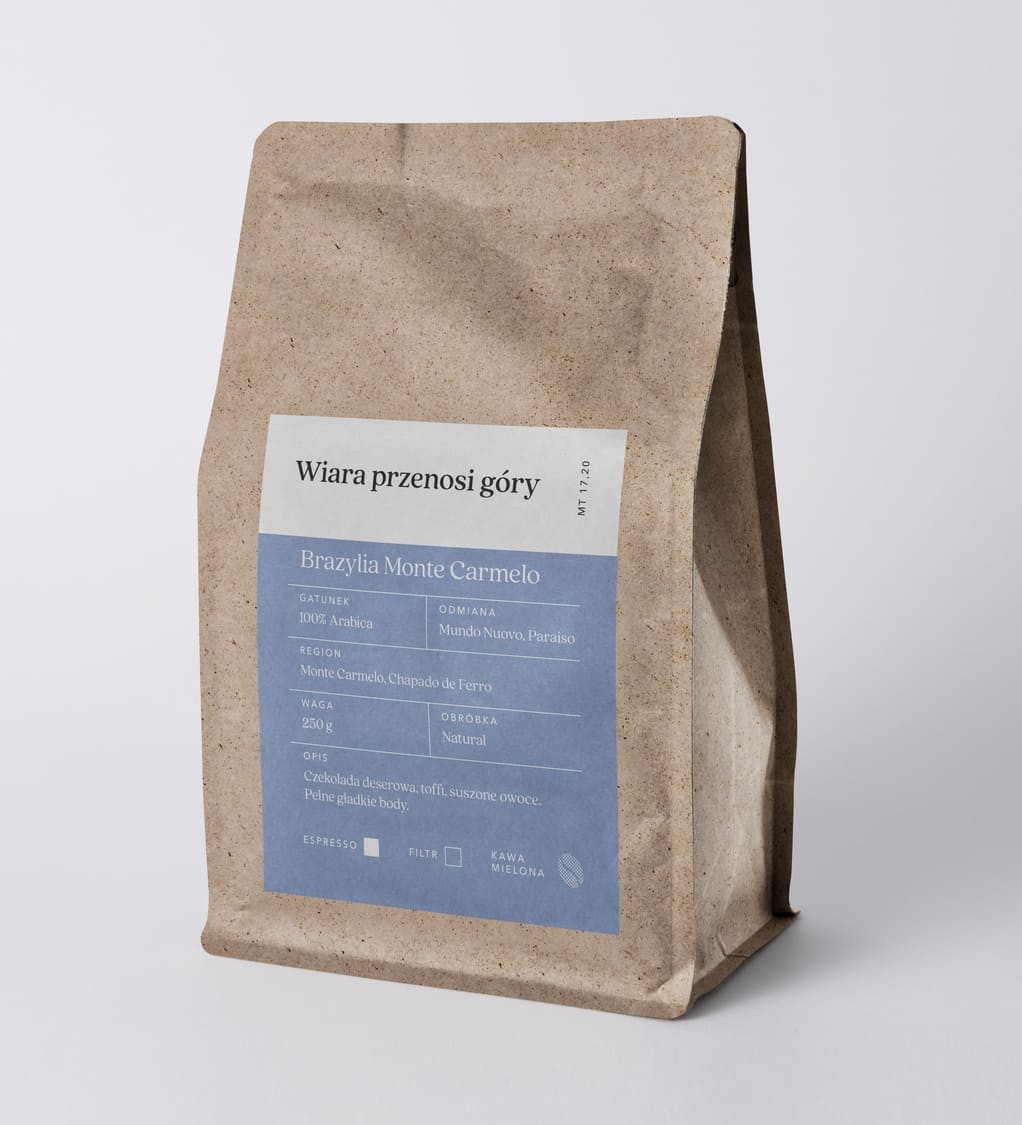 „Wiara przenosi góry” to kawa mielona specialty z Brazylii, o klasycznym profilu smakowym: ciemna czekolada, karmel, lekko owocowe nuty i gładkie body.