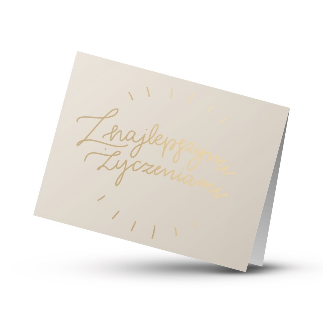 Elegancka i minimalistyczna kartka z napisem „Z najlepszymi życzeniami”, wykonanym techniką złocenia (hot-stamping). Złoty połysk dodaje jej subtelnego blasku, a klasyczny, ciepły odcień papieru sprawia, że doskonale pasuje do każdej okazji - urodzin, jubileuszu, ślubu, czy wyrazów wdzięczności.