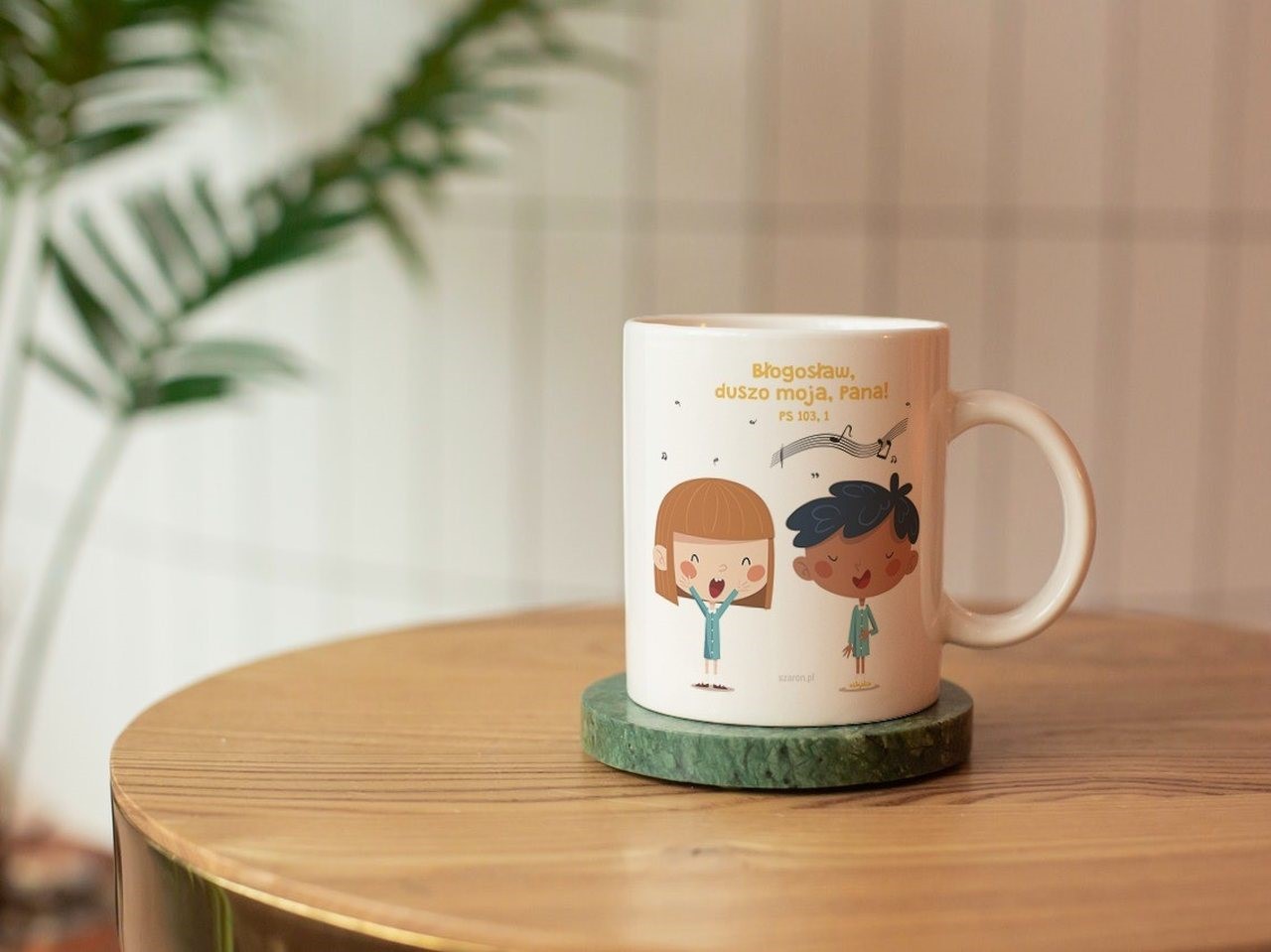 Kubek ceramiczny z wersetem lub tekstem opartym o wartości chrześcijańskie.