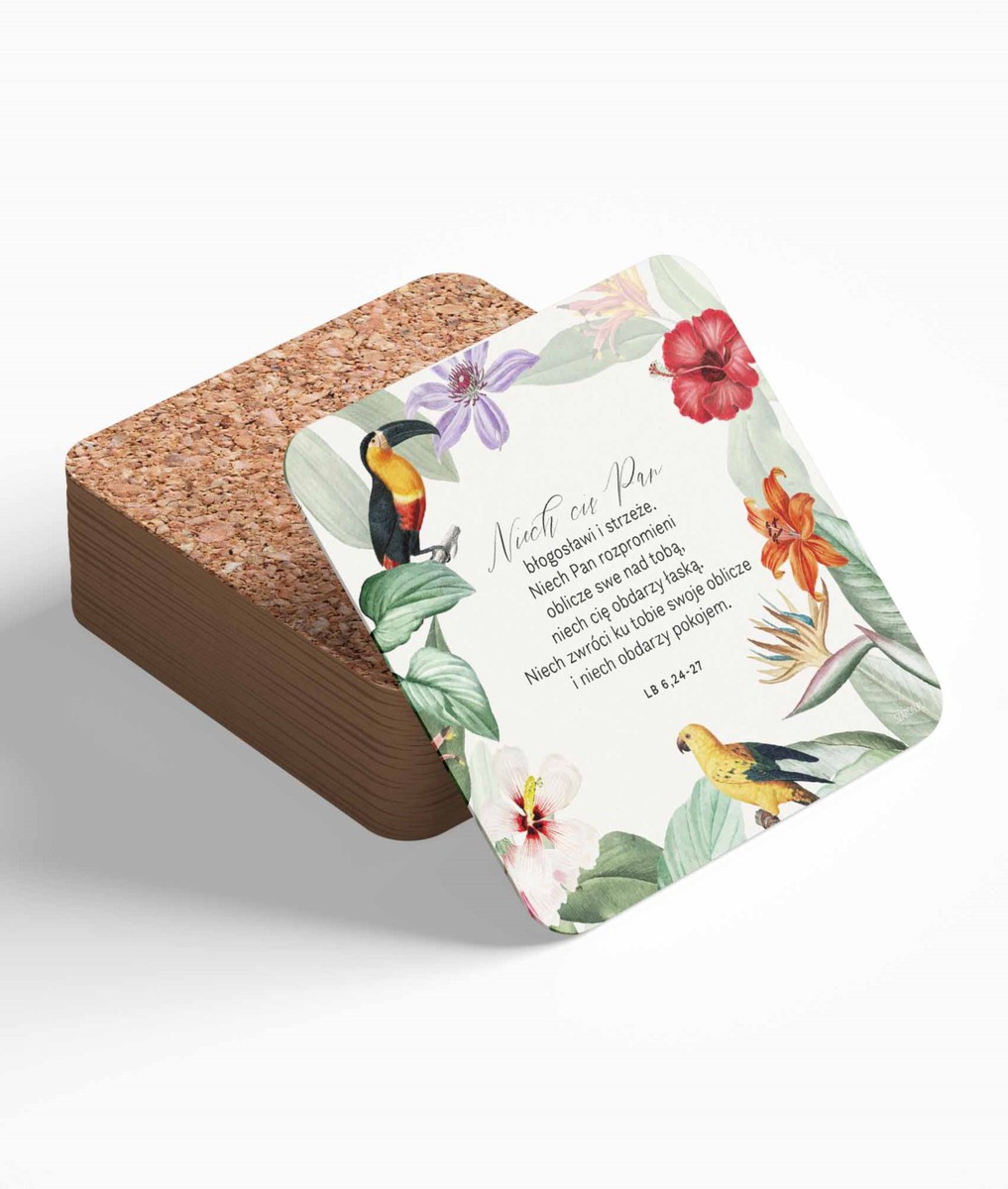 Ten ponadczasowy tekst niesie ze sobą pokój, troskę i Bożą obietnicę obecności w każdej sytuacji. Całość uzupełnia przepiękna tropikalna ilustracja – hibiskusy, papugi i tukany nadają podkładce wyjątkowy, elegancki charakter.