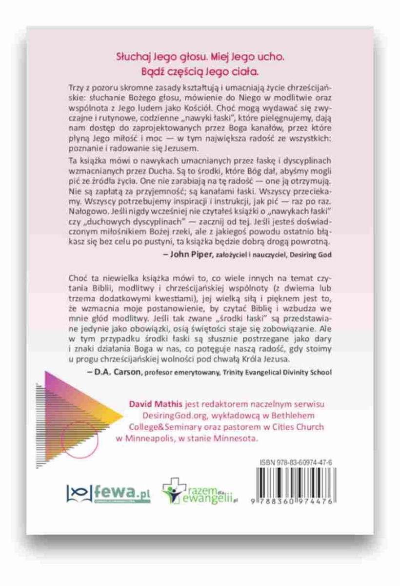 Książka „Nawyki oparte na łasce Bożej” to głęboko biblijne i praktyczne opracowanie, które ukazuje, jak regularne duchowe dyscypliny – słuchanie Bożego głosu (czytanie Biblii), mówienie do Boga (modlitwa) oraz życie we wspólnocie Kościoła – prowadzą do duchowego wzrostu, radości i trwałej przemiany życia. Autor, David Mathis, nazywa te praktyki „nawykami łaski” – są to środki ustanowione przez Boga, które prowadzą do osobistego spotkania z Jego miłością i mocą.